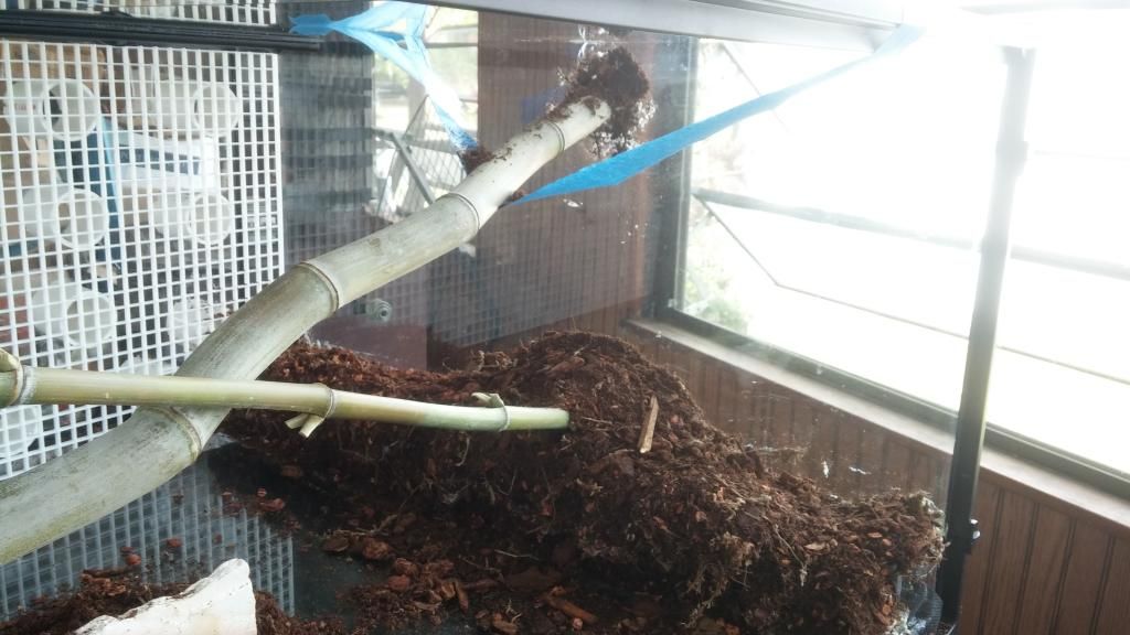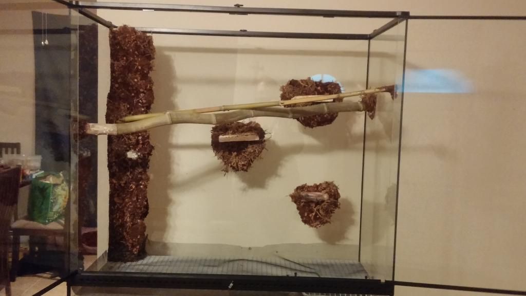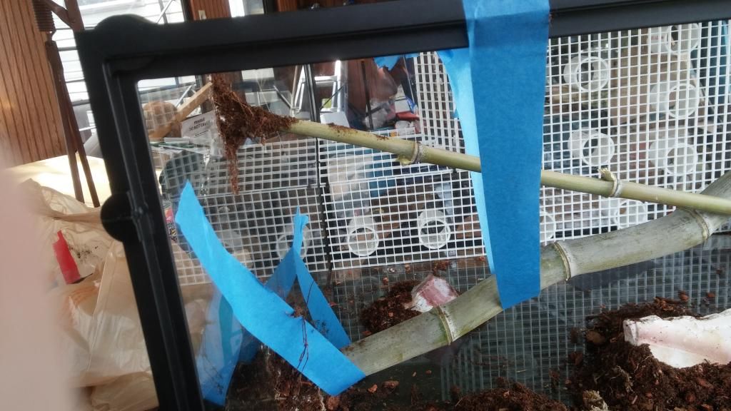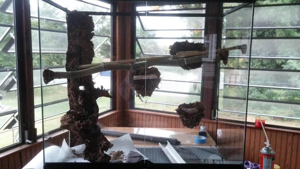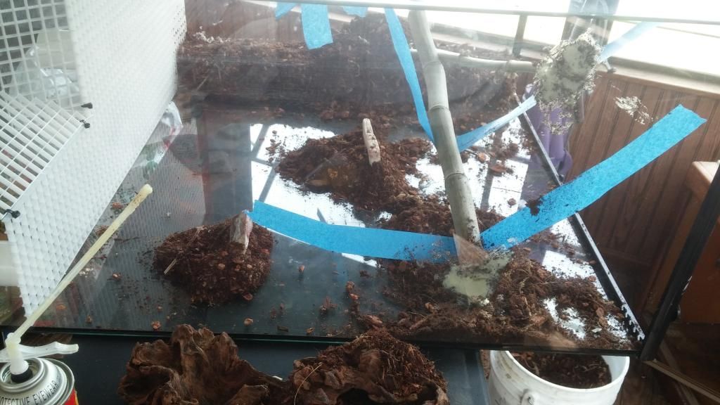 I attempted to tape up the bamboo that will be going across and silicone that in before using anymore good stuff but it's too humid on the freshly clean glass after putting all that abg in the tank and it won't hold the tapeGuess tomorrow I can get the bamboo placed and glued down. after cutting the hole for the water fall. I also foamed up and abg covered the hole in the wood I am using for the water feature.