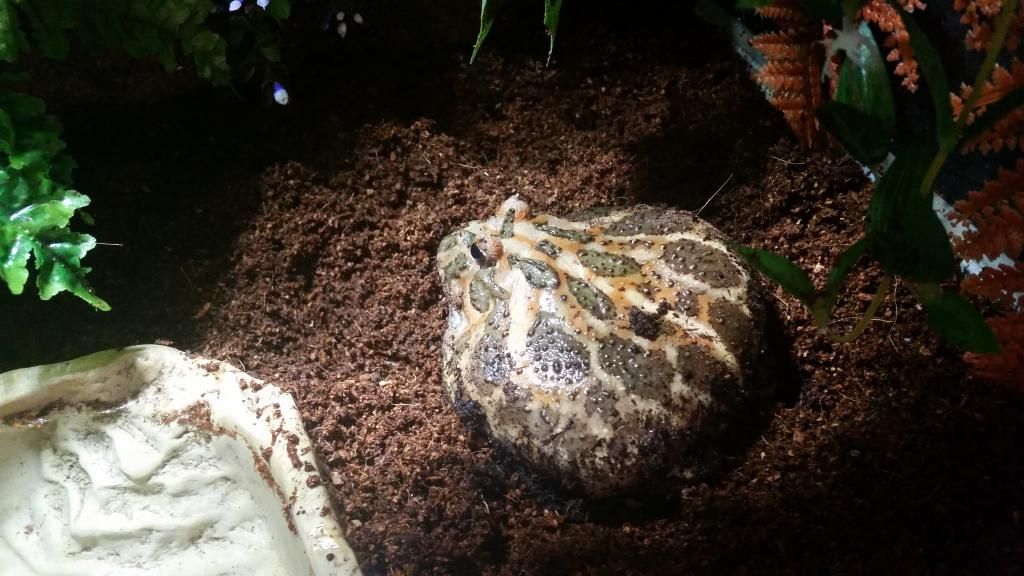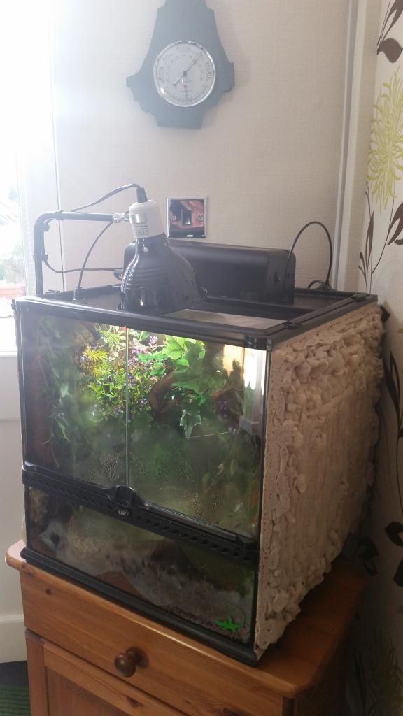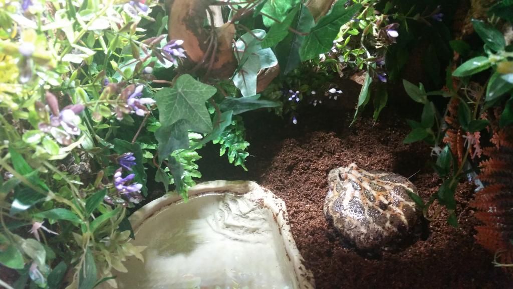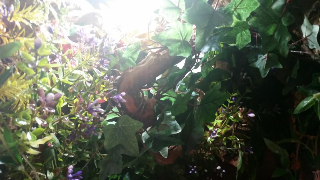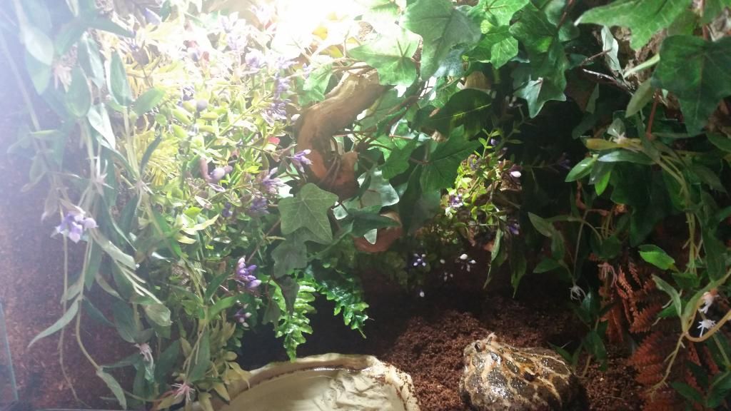 I just got a new tank for Blob and it looks so plain and minimal compared to yours :/ I'm not even sure I'm doing my habitat right looking at your set up... I use an over head heater- not a ceramic one, but I am considering getting one- with a dimmer along with a heat mat, and I have a fogger to compensate for the drying that it causes too. Where do you find all of your decor? I can't seem to find anything but boring plastic plants and water bowls...