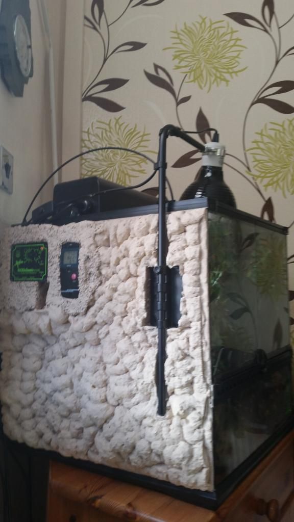 The water bowl is made by Exo terra and was the largest I could find. I use a pollywog auto misting pump, it switches on for 10 seconds five times a day. The thermostat has a magic eye to drop the temp after dark. 82% at the warmest part of the tank during the day and 76% in the coolest. The temp drops by 4% all round at night.