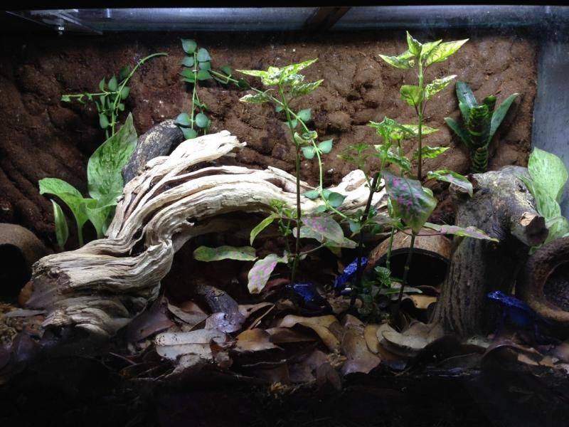 added a new chunk of wood. i keep pouring dechlorinated water on it, so it will stay damp soon enough. but it is dry in the pic. i also got a little Brom, and a few viney plants, since my Tilandsias died. the frogs seem to like it.