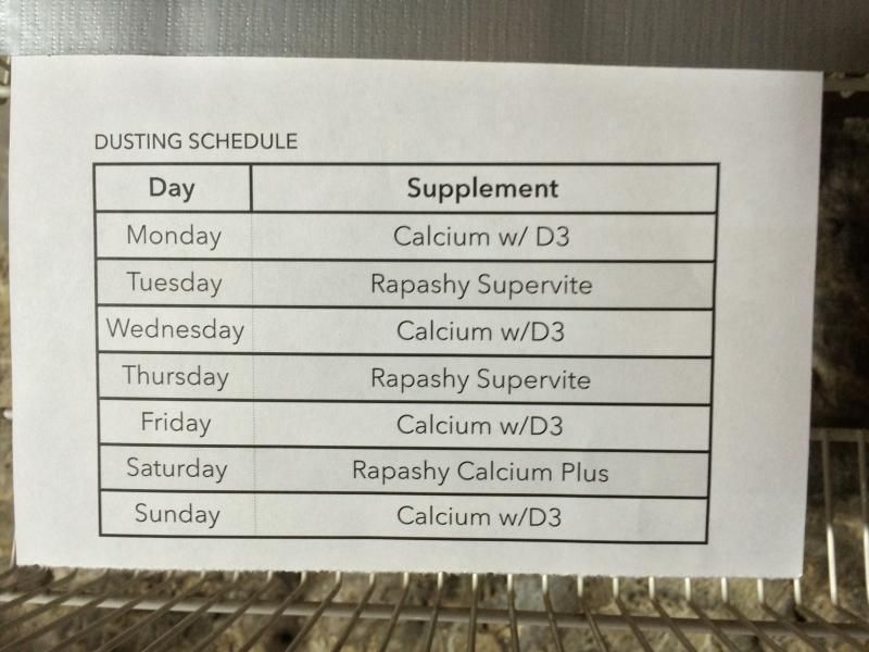 I also finally printed up my dusting schedule and posted it by the fruit flies and supplements to others in the house would know what they need to dust flies and crickets with. (Yep I am aware Repashy is spelled wrong in the picture but it has since been fixed lol)