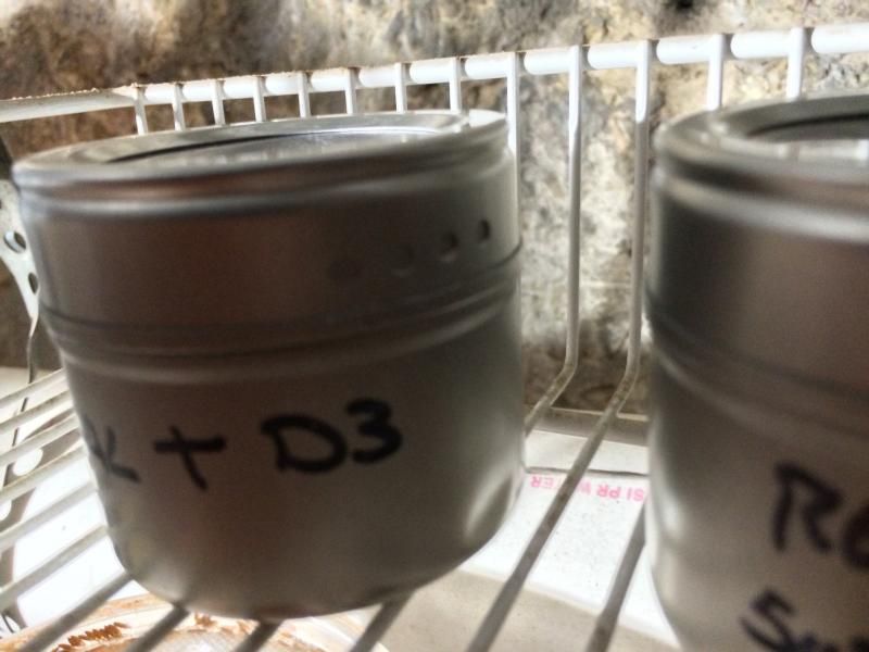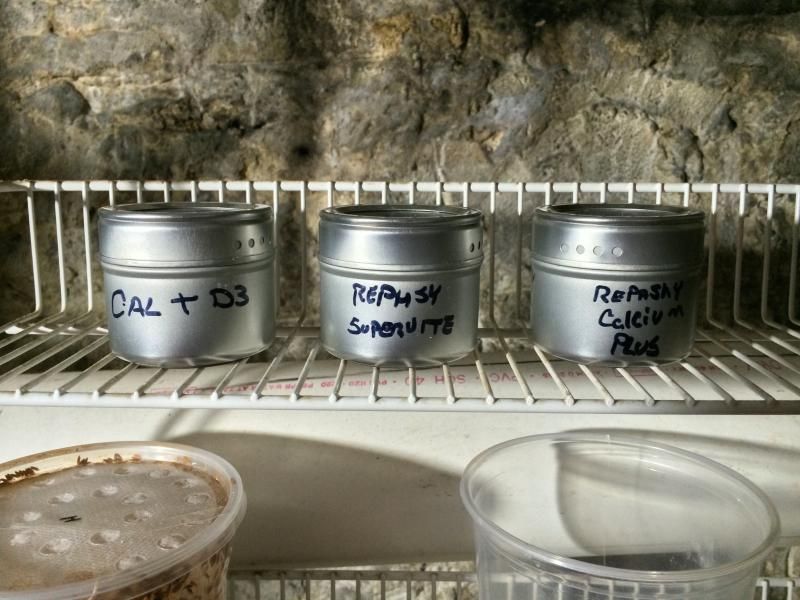 Also got some Spice shakers from Bed Bath and Beyond (they were dented so I talked the manager into selling them to me for $1.00 instead of $4.00 they were asking for them. I then put some of the supplements in them and then just shake them over some flies. This allows me to put the remaining supplements in the refrigerator until I need them. (Still going to replace the jars every 4 - 5 months regardless, but I feel better at least trying to keep them fresher.