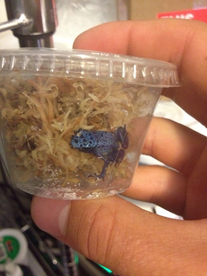 Just received five Dendrobates Tinctorius Azureus from Josh's frogs! They are well started juveniles and are very active. Still a bit skidish but a week or two in the new tank will settle them in. Beautiful Darts!