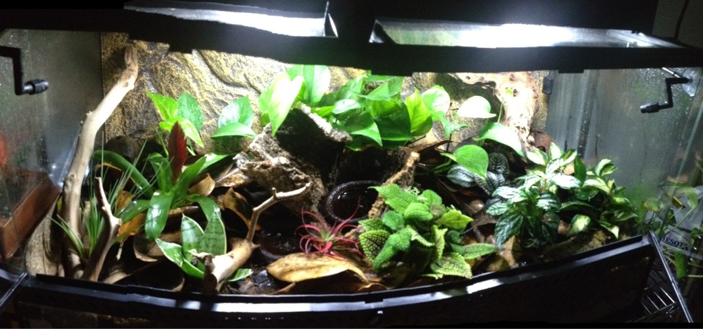 This project is my first ever PDF build and I can't wait until i can enjoy it with a group of Tincs in it. It's a Exo Terra 36x18x18. I purchased a kit from Josh's Frogs ( false bottom, ABG mix, leaf litter, branches, coco hut, and springtails.) I also have a Exo Terra canopy that houses 3 of Josh's Frogs Green Grow LED light bulbs. This tank will have an Exo Terra Monsoon misting system along with a fogger. I have a Zoo Med Hygrometer that regulates the heat and fogger. The plants that I have planted so far are bromeliads, two different species of Pilea, Pathos, Tradescantia, and a Peperomia. I'd like to house 4-5 juvenile Dendrobates Tinctorius Azureus. This tank has been up and running for about a week and a half. I will add Azureus's in another 3 weeks. Also pictured is my frog rack that will house two pacman frogs and a RETF tank once I move them all over. Hope you enjoy and feel free to shoot me some pointers or any concerns you may see in how I am setting things up. enjoy!