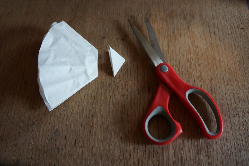 - Take 3 coffee filters, stack and fold in quarters and snip off the point by 1/2 inch to 1 inch.