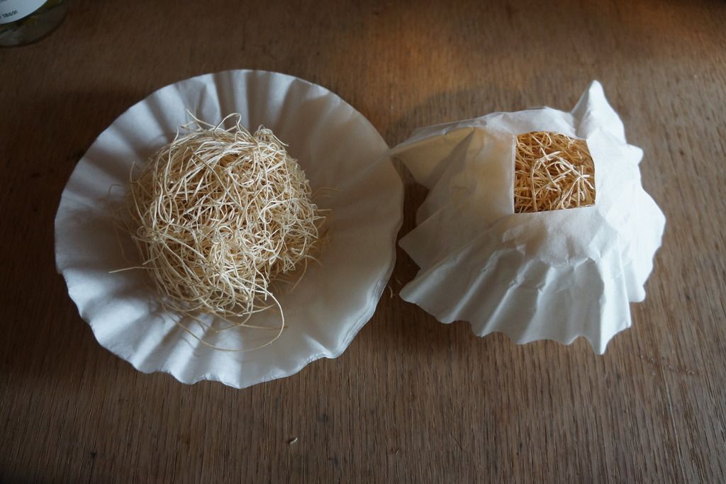 - Unfold the filter stack and put a baseball sized ball of excelsior in the center. The filter paper stack is like a cup (looks like cupcake liner) around the excelsior.