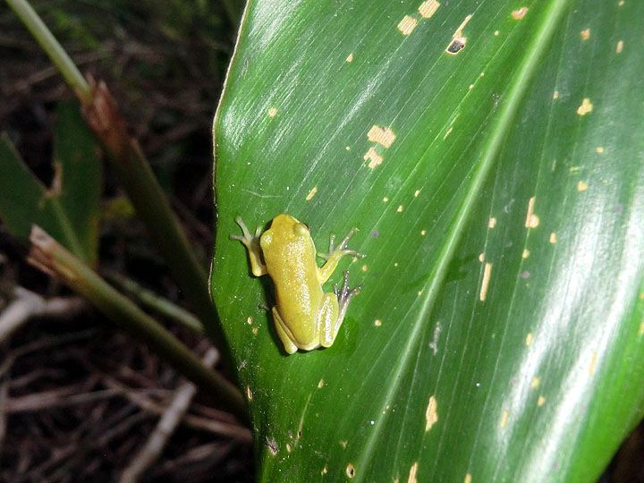 A young emerald tree frog, Rhacophorus prasinatus, having a rest before setting off.