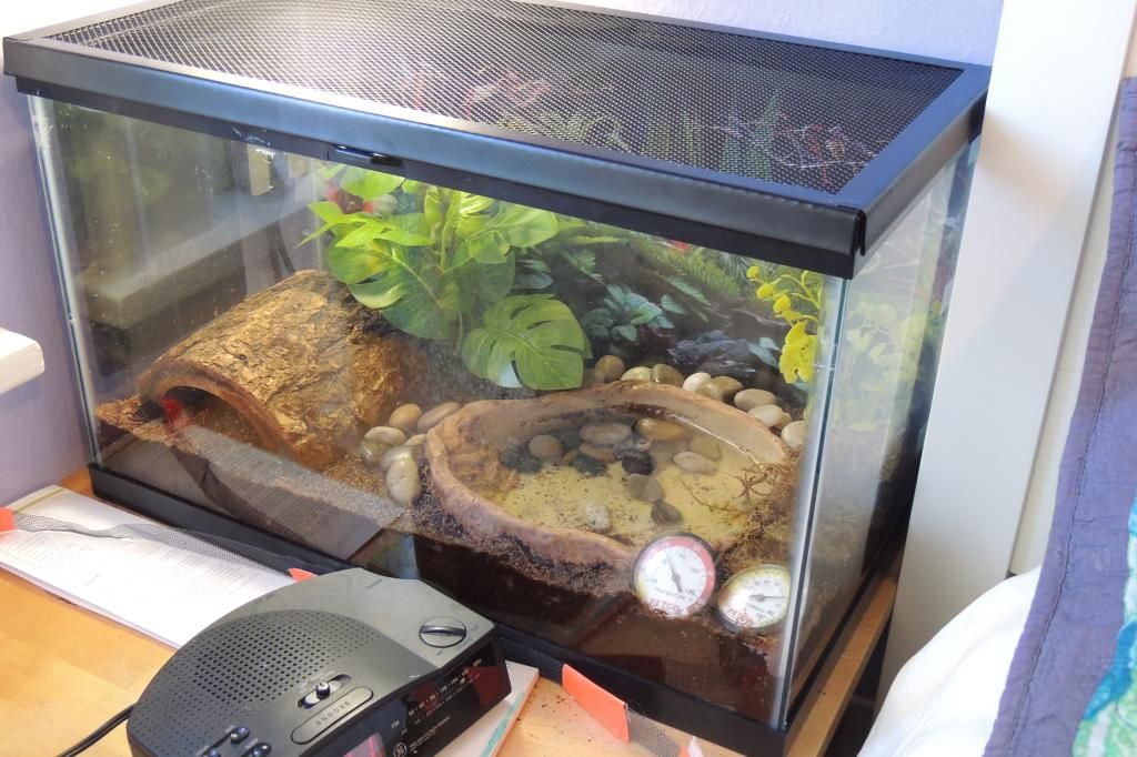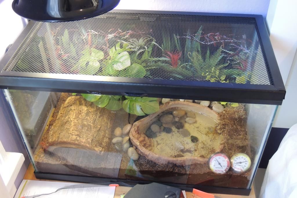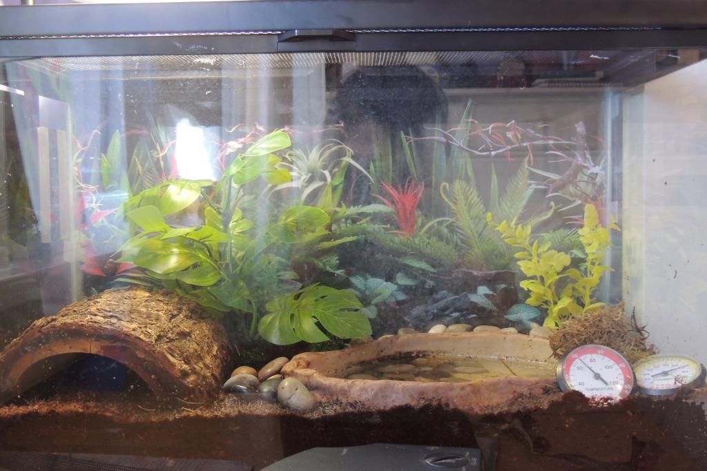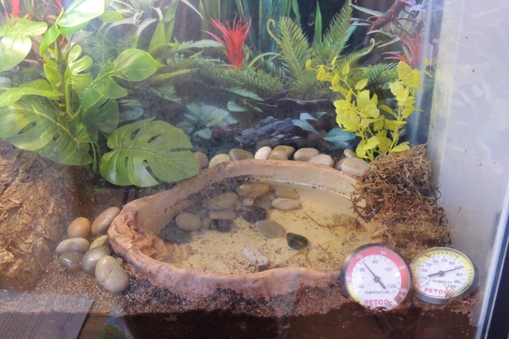 It's a ten gallon enclosure that houses 3 FBTs. What do you think of it? Do you think the FBTs have a large enough water area? I know ideally their water area should be larger but I got thelargest water dish that the pet store had. I can't do a half ad half water setup with a divider because the tank isn't supposed to be filled with water.