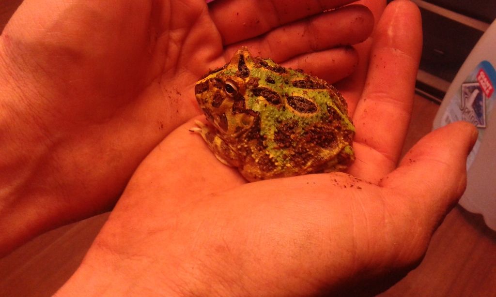 I have mighty large hands. Age is unknown. Go figure... the little cutie is about 3-4 inches nose to stubby between the hind legs. So far it seems shes more interested in watching us then anything. Its cute. Ate d3 n calcuim dusted crickets. On top of it we keep crickets, gutloaded from day one. So, fingers crossed, and it does look alot like a C. Cran. Though i found anold post here and do not understand the fake eye part to well... and alot of the pics were gone...