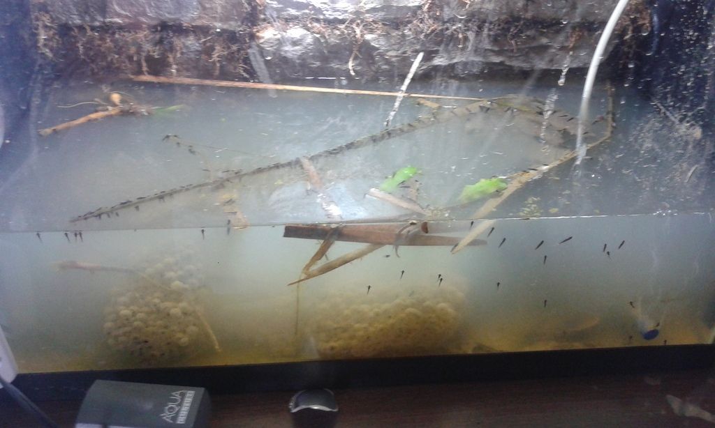 Well, begin story. An ornery old hillbilly im friends with has a pond in the middle of the woods. His daughter bought him out. Small child, well, no pond... So. In the last week of the ponds existance, ive been so so busy. Gathering natural pond mud, water, bugs, and whatever holds still long enough to snag. Well the past few mornings have yeilded the miracle of life. 4 massive, and i mean BIG clusters of frog eggs. All new within the week, and all hatching. In, yes alge and bug full water(yummy tad diet). With an airstone. So, from homework here and there, and their just massive size both cluster and egg, bullfrogs... found a ton of peepers but no sign of the parents of these big guys... when the tads hatch they are a good 1/4 inch...