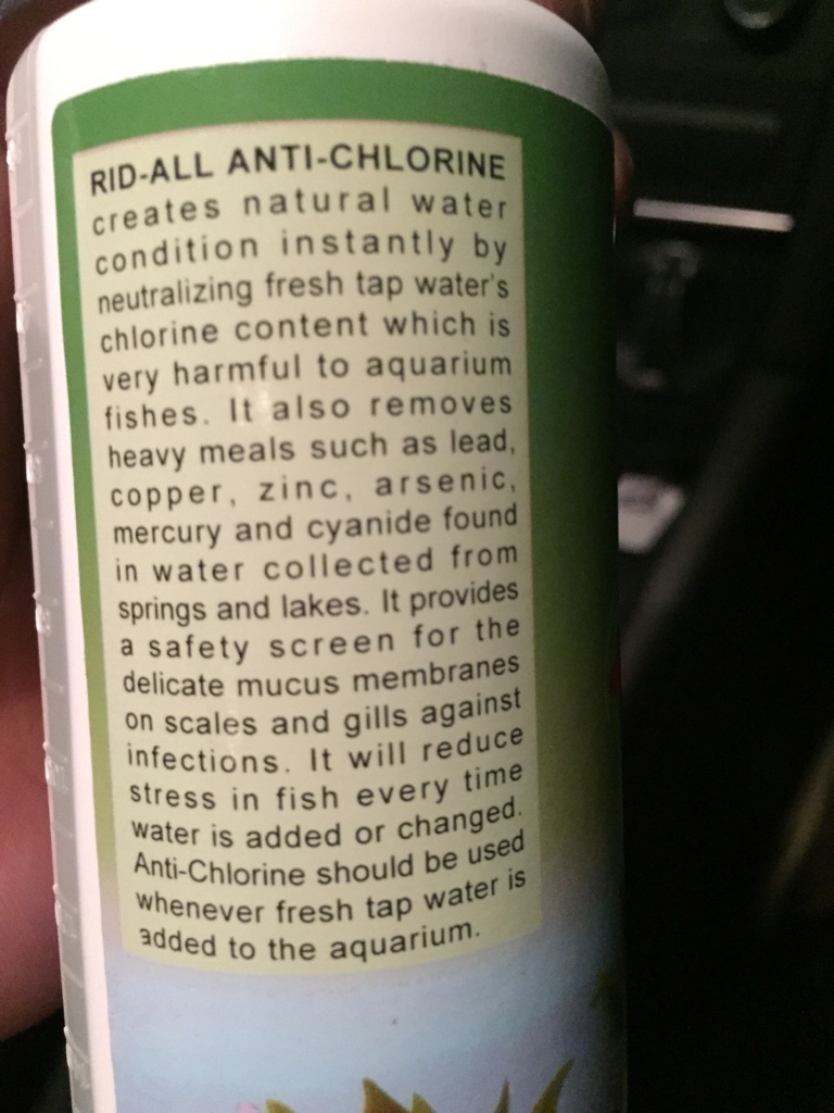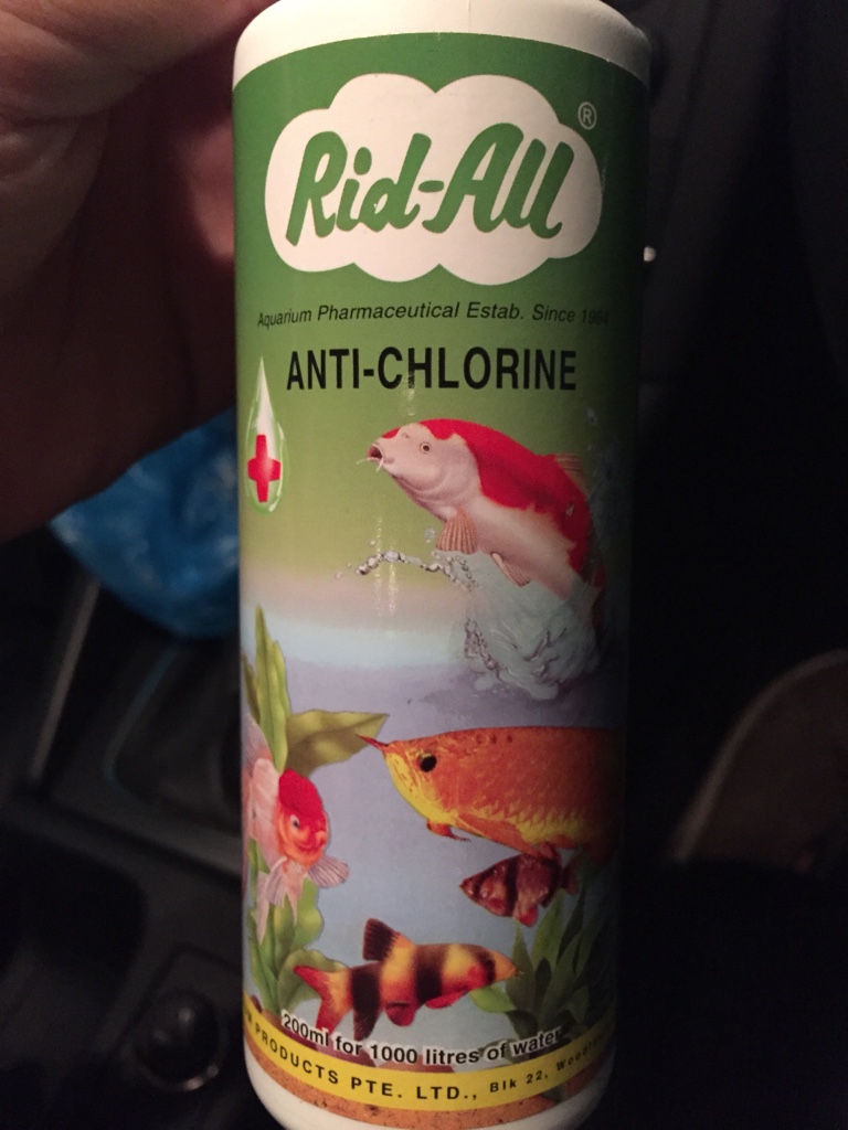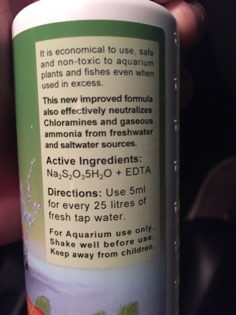 Water that has been treated with a water conditioner (API Stress Coat, Prime, Aquasafe) to remove chlorine and detoxify heavy metals.![]()