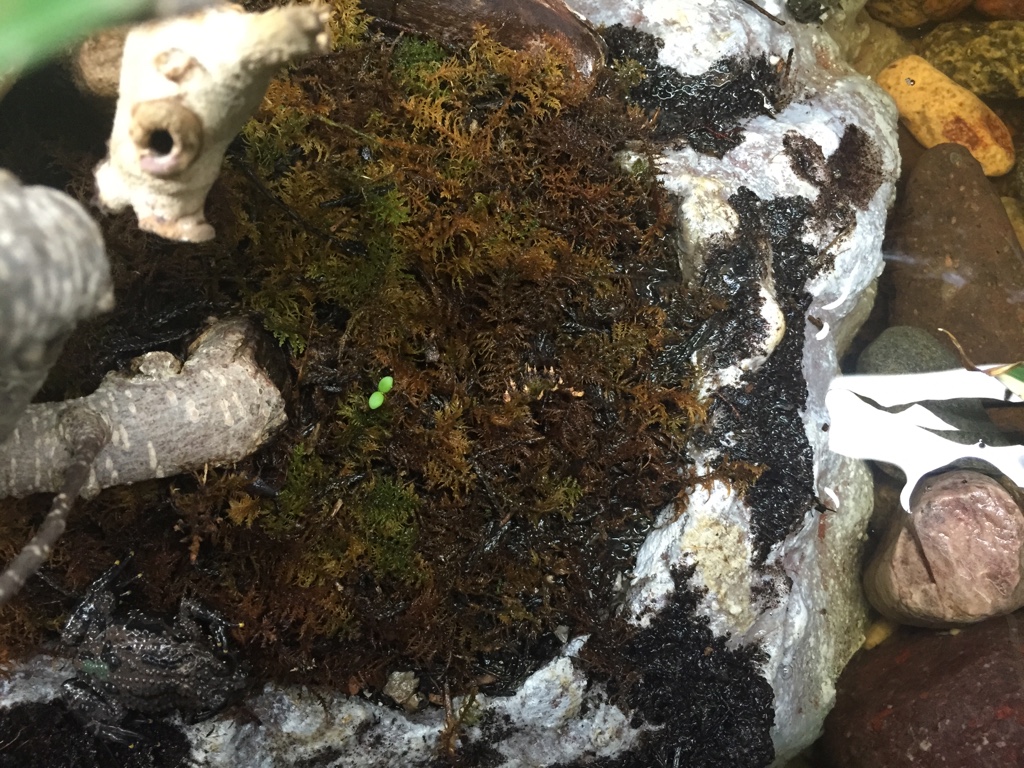 On the bottom, you can see that the moss is a darker brown than in other areas. That area, for some reason, is ALWAYS soggy, I never even water it. It seems to be the most common place my little guys get in and out of the water. I'm actually wondering if I should just put some sort of aquatic moss there, since it's always saturated. You can actually see that it's puddled.