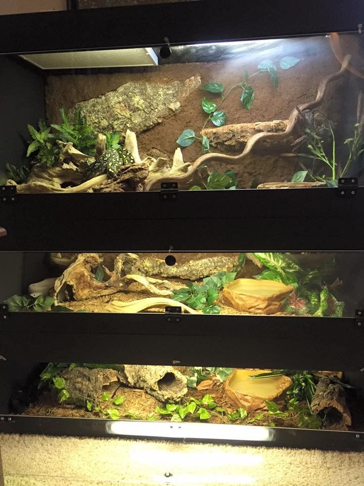 The substrate in the enclosures is cypress mulch, heating is achieved with PH-3 Pro Heat Radiant Panels on Herpstat II thermostats. All cages have a 24" fluorescent light and Orion has an additional 18" ReptiSun 10.0 for UVB on a timer during peak hours of the day.