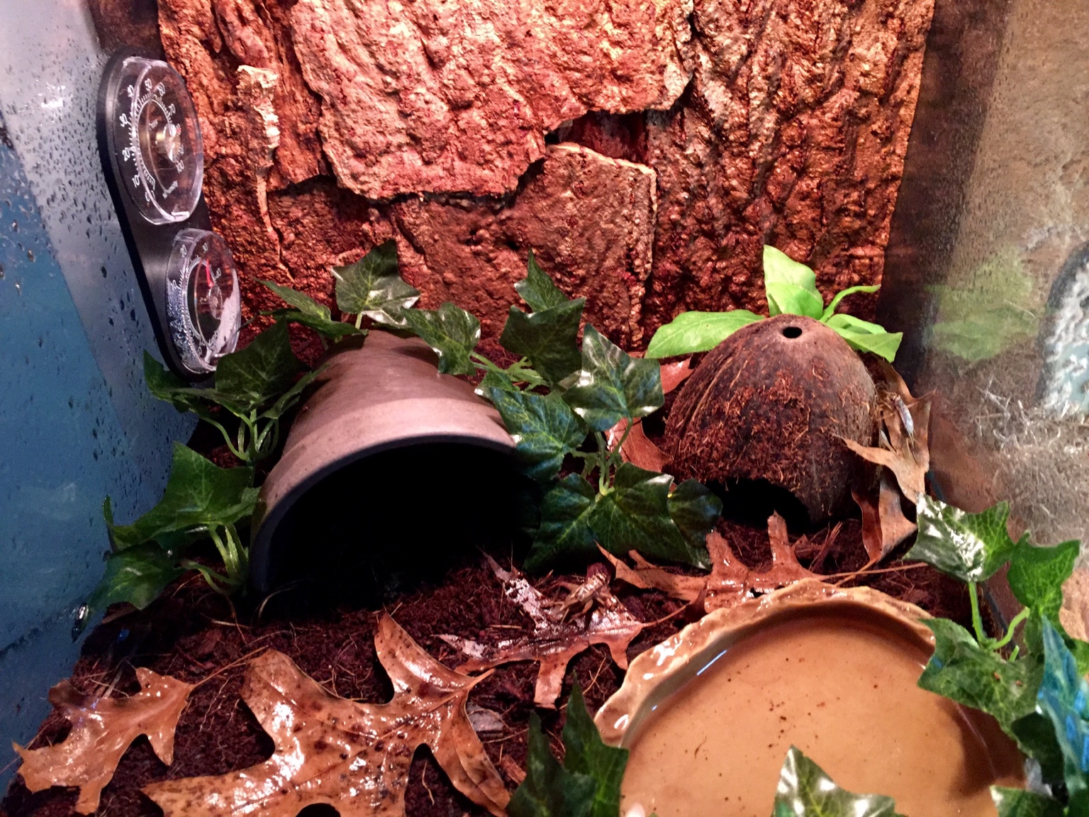 The humidity is between 60 to 80% sometimes a bit higher when the light goes off. I try to keep it between 70 to 80% during the day with daily misting.I read that that was the preferred humidity level.There is a hide at the warm side and one at the cool side, and also a shallow exo terra waterdish, I added some fake plants as decor but didn't want to make it too complicated for cleaning purposes and not to make it too crowded in there.