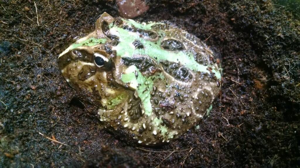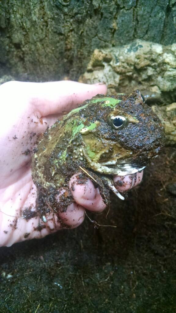 Hey guys! It's been a while since I posted to this sub topic, but anyways. Last year at the Tinley Park reptile expo, I picked up a little samurai blue pacman frog, I raised him, and he's become huge! So here he is! (Can anyone tell me why he lost his blue coloration? Most adult blue pacs i see look like they lose their blue color...)[IMG][/IMG]