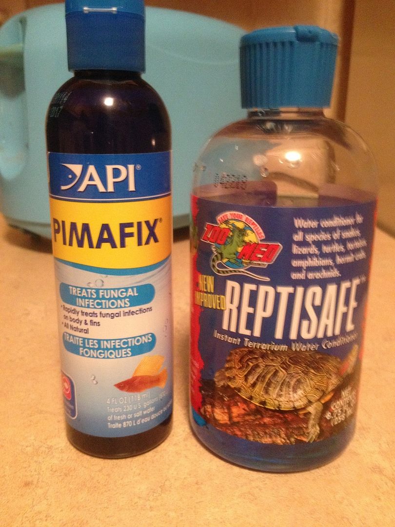 API PIMAFEX treats fungal infections for fish. Dose accordinly to 3gs of water as well as reptisafe to remove chlorines and ammonia from water.