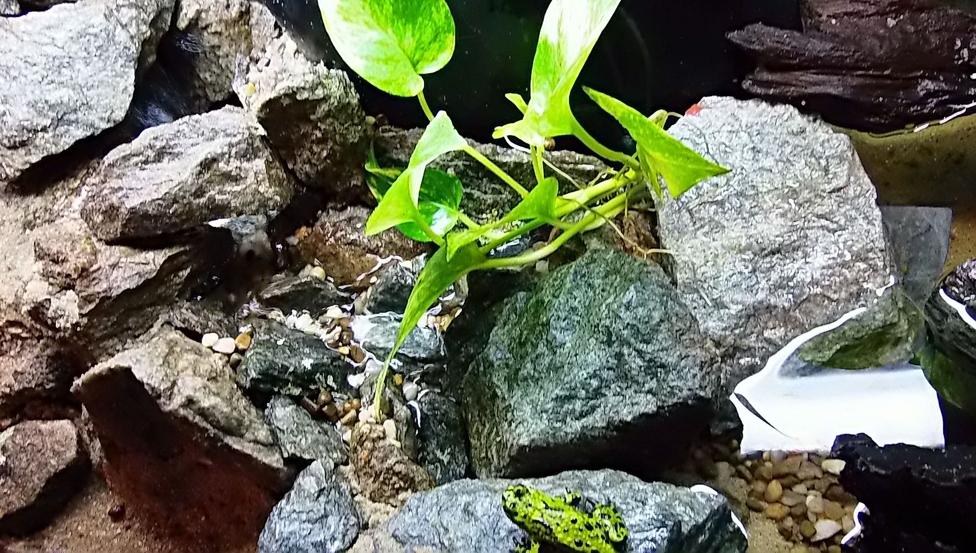 4) In the "pond" area I had a lot of aquatic plants in the water column (like amazon swords etc), in the back of the pond area I had pots of pothos plants that grew through out the tank - the stems would suspend themselves in the water for the frogs to climb on or hold on to, and I had a large piece of driftwood so they could climb/perch when ever they wanted.