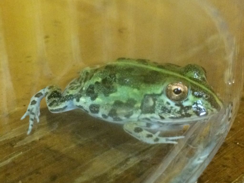 That is definitely a dwarf. Looks like a nice male too. The Giants as babies have the white spot on their tympanum too. The Giants will have three bright green stripes. Yours has one distinct yellow tan line.![]()