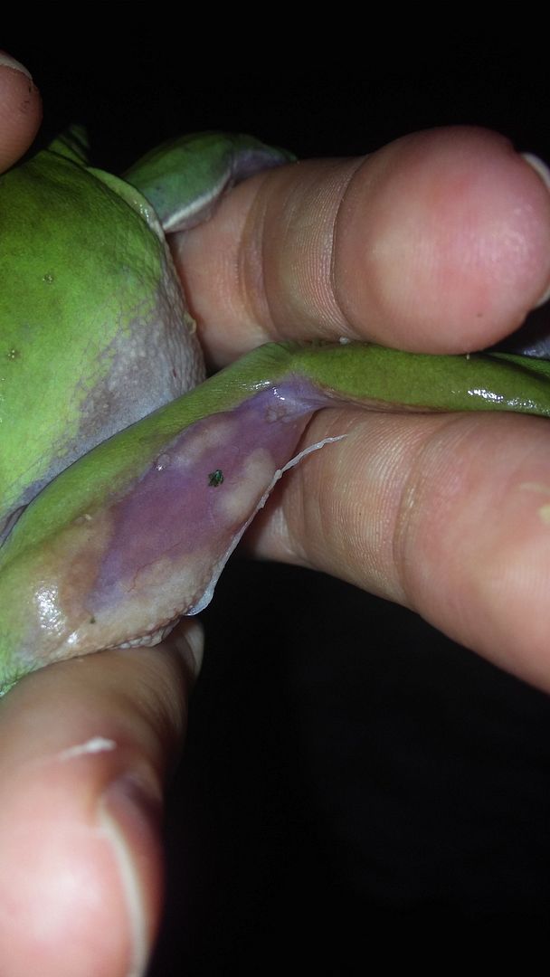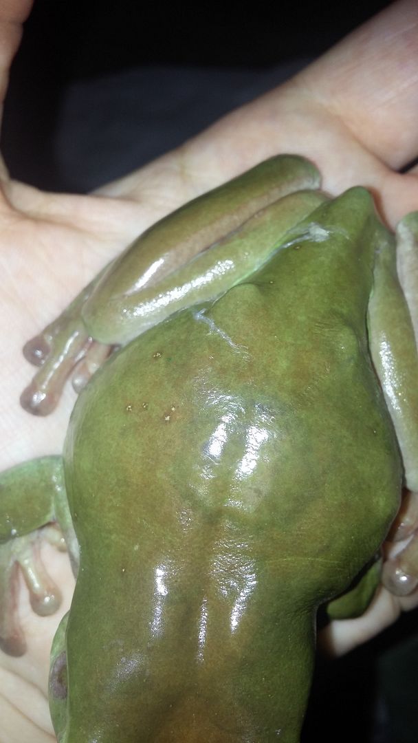Ok so, I "rescued" two Indonesian whites tree frogs from Petco about a week and a half ago. They were skinny, kept in an enclosure of essentially ALL water save some floating logs, and just didn't look good at all...I know it probably wasn't the best idea but it broke my heart to see them like that. Anyway, I got home and started to really examine them and the smaller of the two checked out, besides some runny poop and he was ridiculously hungry. (I tossed a few crickets dusted with repti cal in their tank when I got home didn't expect them to eat right off the bat but they went nuts over the food like they hadn't eaten in days!) Anyway, the larger of the two is my main concern. He has this odd spot on his back that is kinda raised up a little. It's very subtle. And today when he was jumping around and eating, I saw a flash of white on the inside of his leg. There are two cylindrical white things on the inside of his back right leg that are under the skin. The two of them have gone through a week of mela fix treatments and they are on their week off until Sunday.(I found a link on another frog forum I have run across with the dilution and such for frog treatment with mela fix.) now that they have had said treatment and have been with me for a bit, their poop is solid again, they still are voracious eaters and are plenty active(and talkative might I add...we might have had a few "conversations"...lol)So the only thing going on are those two things with the larger frog.(his name is Venusaur btw, so I'll refer to that from here on out.)As soon as I can figure out how to attach pics I will.