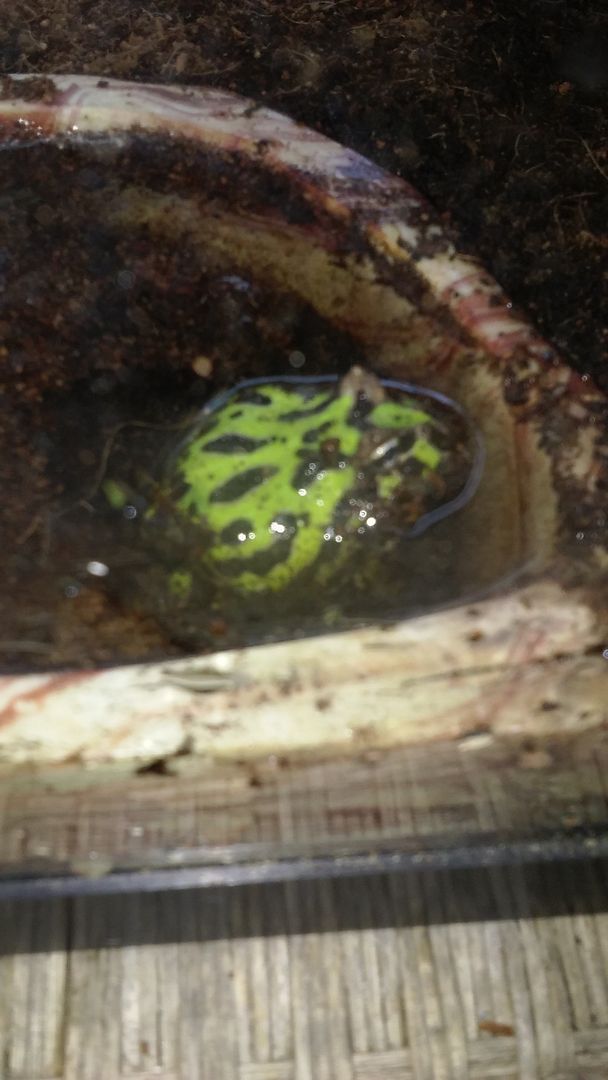 I just purchased this guy from petsmart today, and I was wondering what species it might be? It's my first Pacman frog. She's bright lime green with black blotches. The contrast is quite striking! My camera is a little outdated, unfortunately, but I think I got a decent picture.