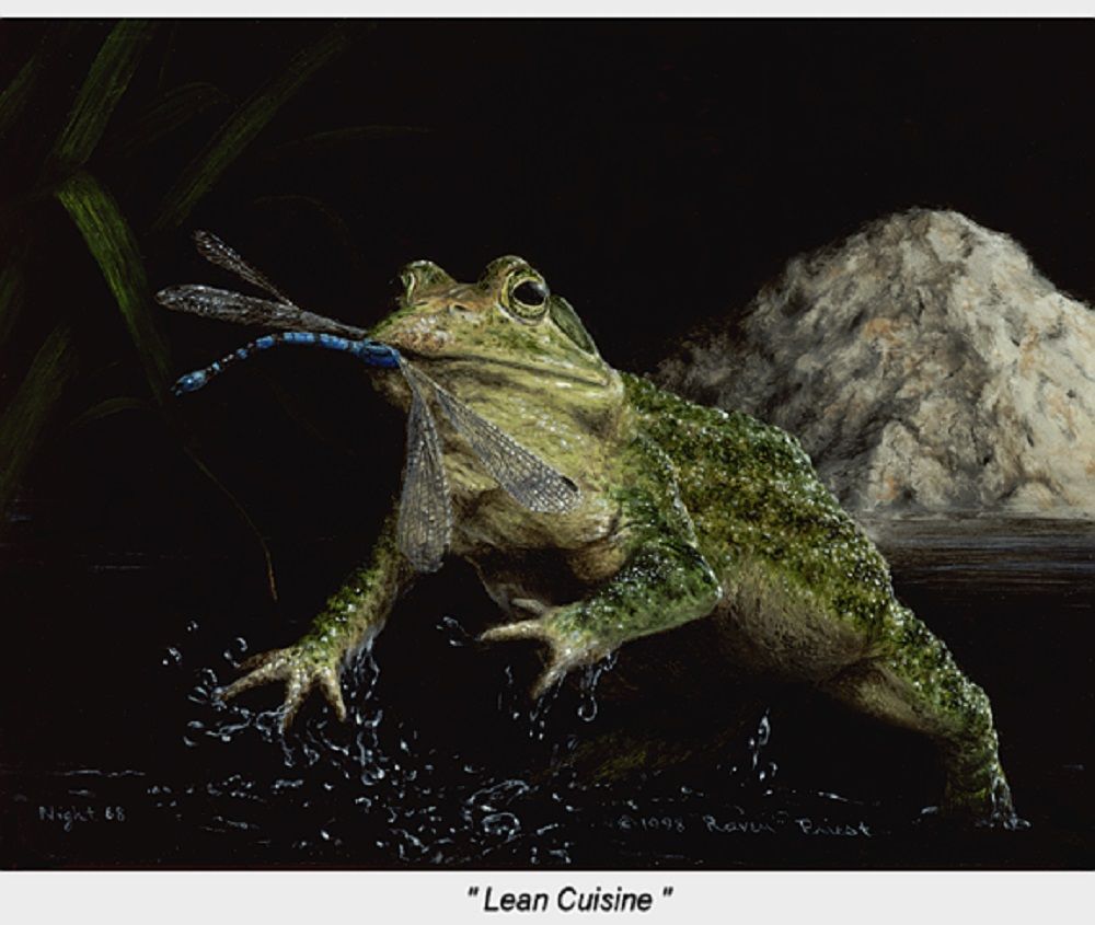 Little bit of background: I was a computer systems engineer. Y'know - back in the day when a 10 megabyte hard drive could move the world. LOL. Gave up that career to bring my son into the world and give him a good start. Growing up, I'd always been known by everyone as "the artist" alternating with "mother nature". Both fit equally well. I spent all of my time in the forest preferring the company of the woodland creatures to my own species. Critters are generally quieter and less offensive. Just sayin'. At least my parents always knew where I was. So, my late husband encouraged me to pursue an art career to supplement the whole son-rearing thang. Little did he know that he created a monster. I became a professional wildlife artist. That involved touring the country and exhibiting/selling my paintings and limited edition prints at about 26 wildlife art shows per year. For 15 years. Inotherwords: I was on the road A LOT! Here is one of my paintings entitled "Lean Cuisine": (Lemme know if it doesn't show up, okay?)