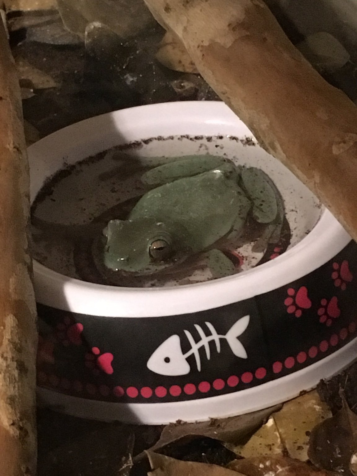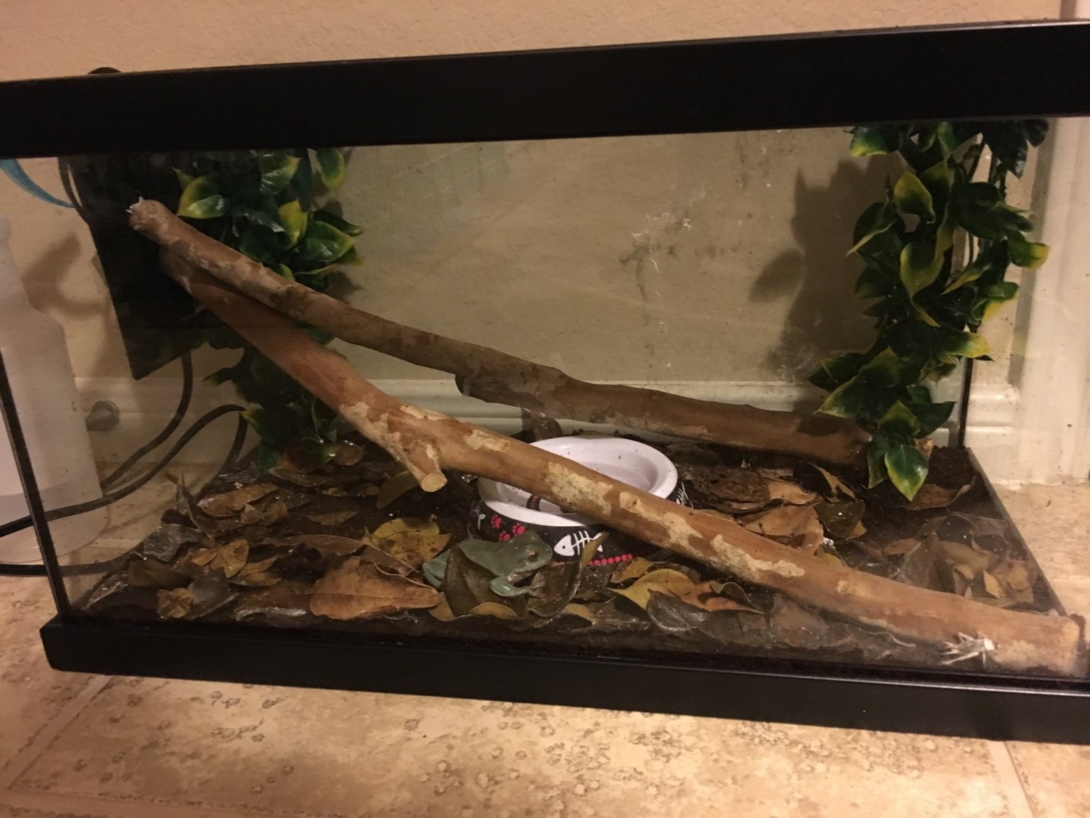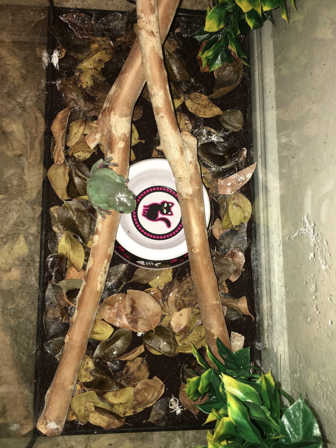 I am brand new to the forums and am currently putting together a whites tree frog ( dumpy tree frog) setup. I am using a 10 gallon tank with eco earth substrate. I have a small heat pad for the side to help keep the tank warm. I also have a exo terra UVB 5.0 bulb to help boost the frogs activity. I have a large corner water bowl and a large artificial fine for the frog to climb around on. Anyway, I work at a pet store and am planning on getting one dumpy frog to start. I have a few questions though. Am I missing or lacking anything in my setup? Can I keep 2 frogs in the 10 gallon or do I need to use my 20 gallon high? What do I need to know as far as handling the frog and holding him? What do you recommend feeding him other than crickets? I have done extensive research and feel that I am ready to pick the frog up next week. With that being said....feel free to give me any advice if you have experience with whites tree frogs. Lastly, I can't wait to get the setup rolling and get myself a little froggy friend!