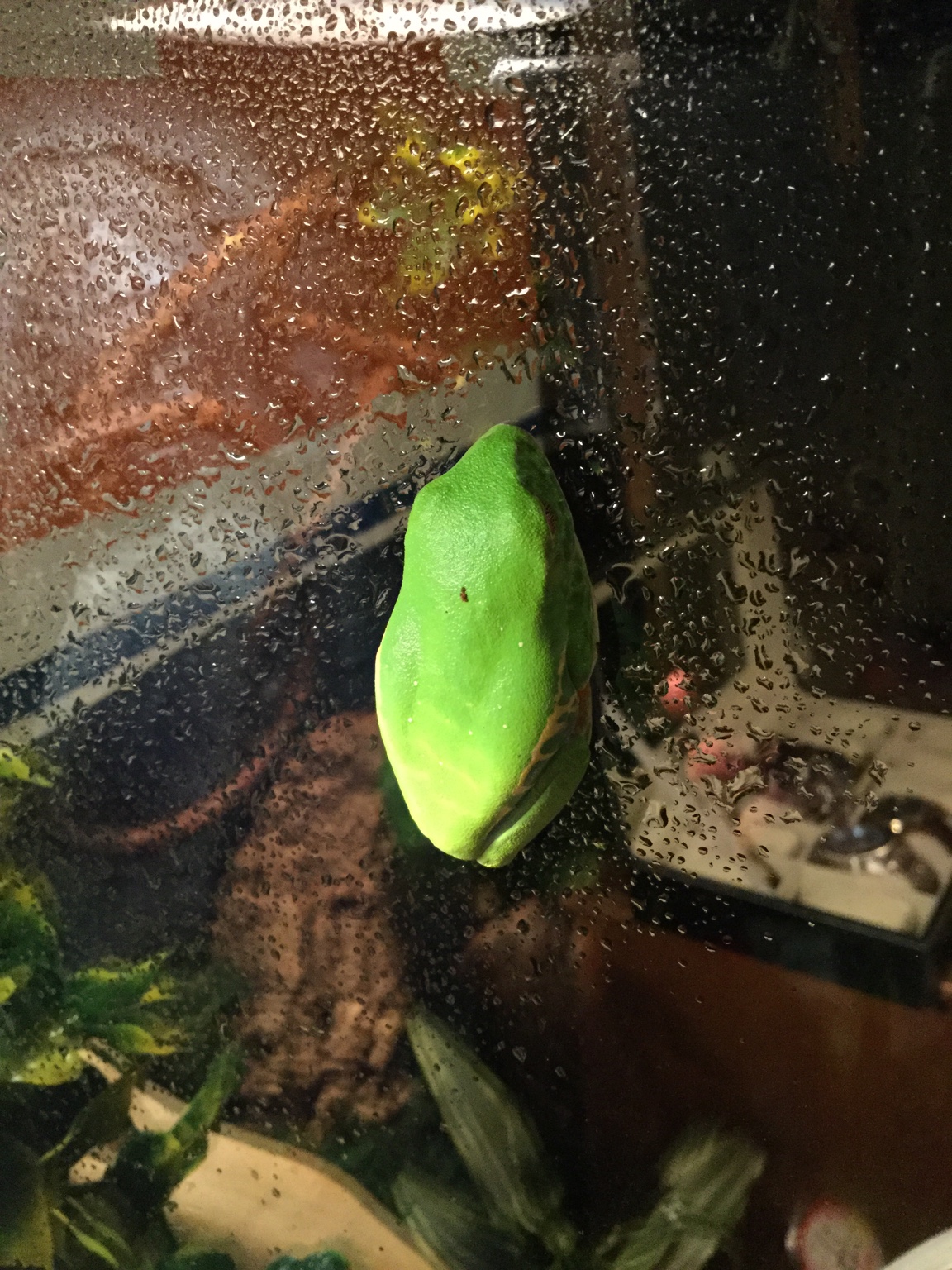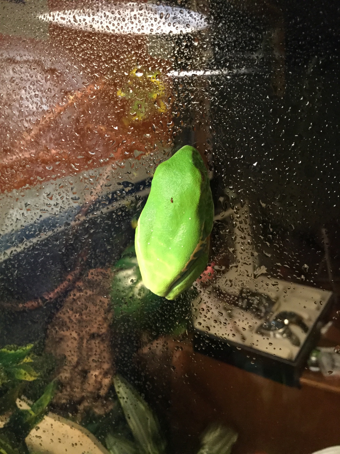 okay, so i learned the white dots are normal and she probably had them the whole time but these horizontal wavy-like lines are giving me some concern. Here is a photo of what my red eye tree frog looks like on its back. However this is not my specific red eye and a picture I found on google. If anyone can help me identify what this is it would be greatly appreciated.