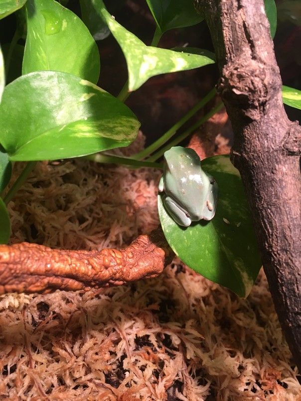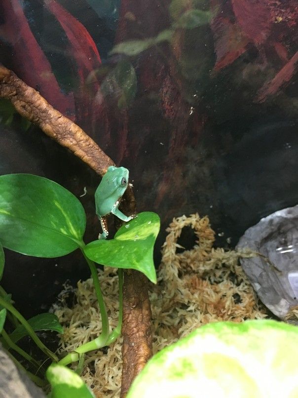 Anyway I kept his tank around 80F during the day and 78F at night, with humidity averaging from 40-50%, proper conditions from what I've read for a Waxy monkey juvenile. 50W basking light during the day, and 50W moonlight at night, also a 13W Repti Glo 2.0 compact which provides the small amount of UVB essential for juvenile health. A water dish was filled with distilled water, but i never saw him bathe in it. Occasional misting with distilled water which actually should have been dechlorinated tap water to give him some critical minerals, but not a huge problem over this short time period.