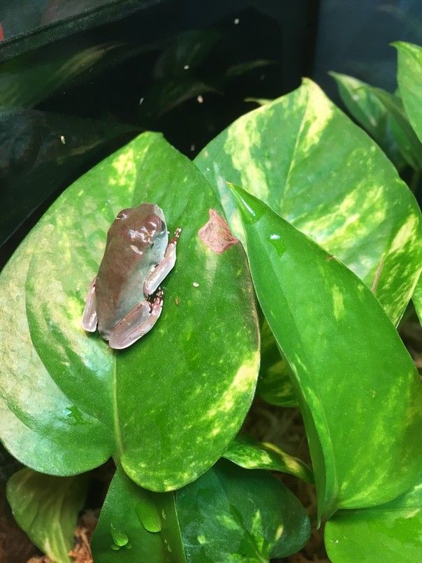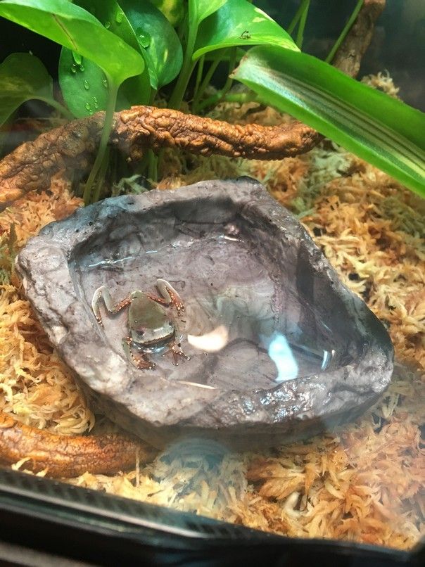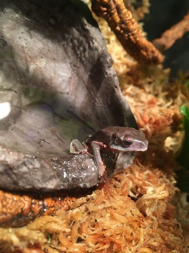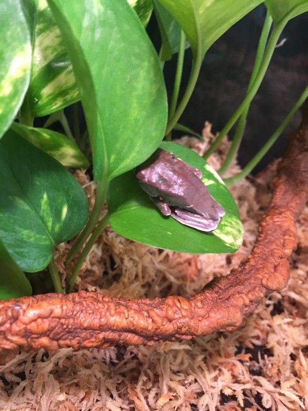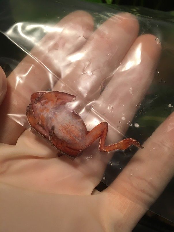 When I received the frog he was in a plastic cup pressed against the plastic sides and sleeping. He sustained a few red rubbings from the ride on his dorsal side that persisted throughout his lifespan. A beautiful frog, favorite activity: sleeping on leaves.