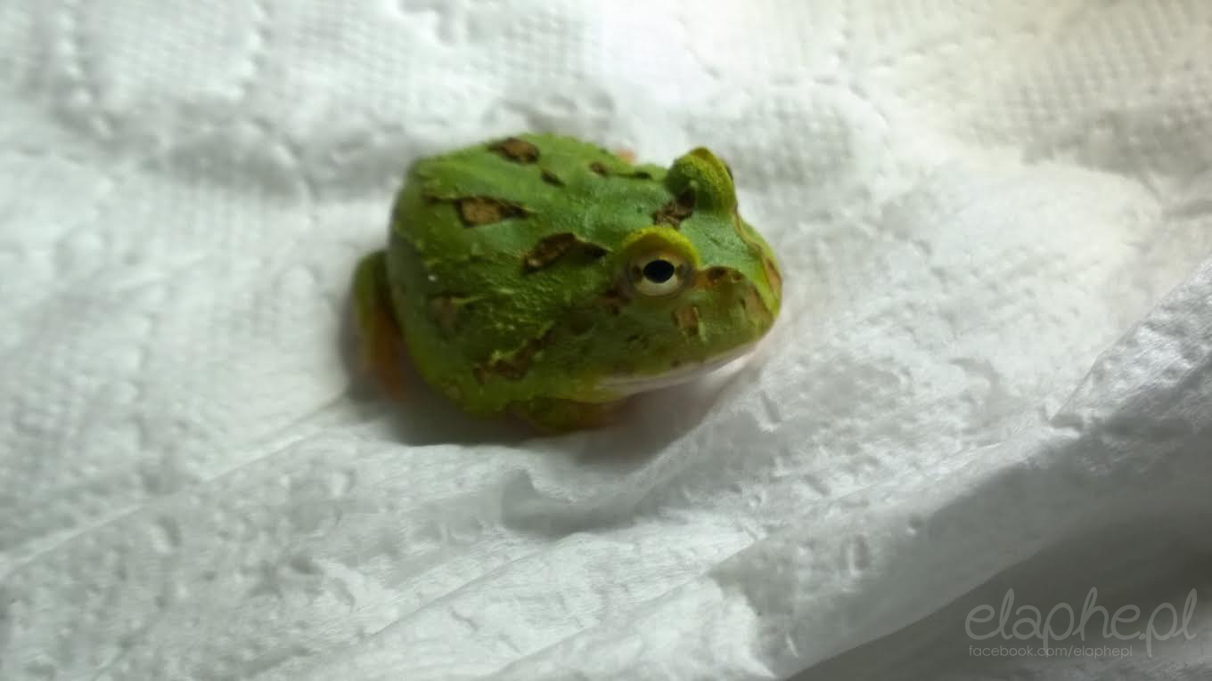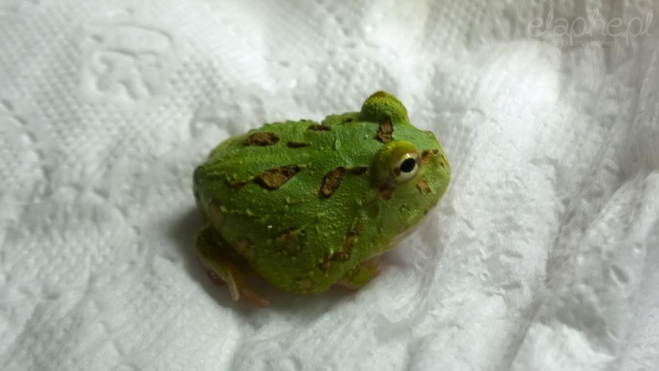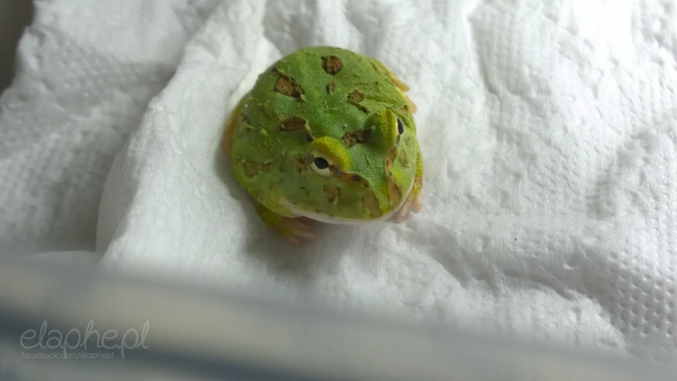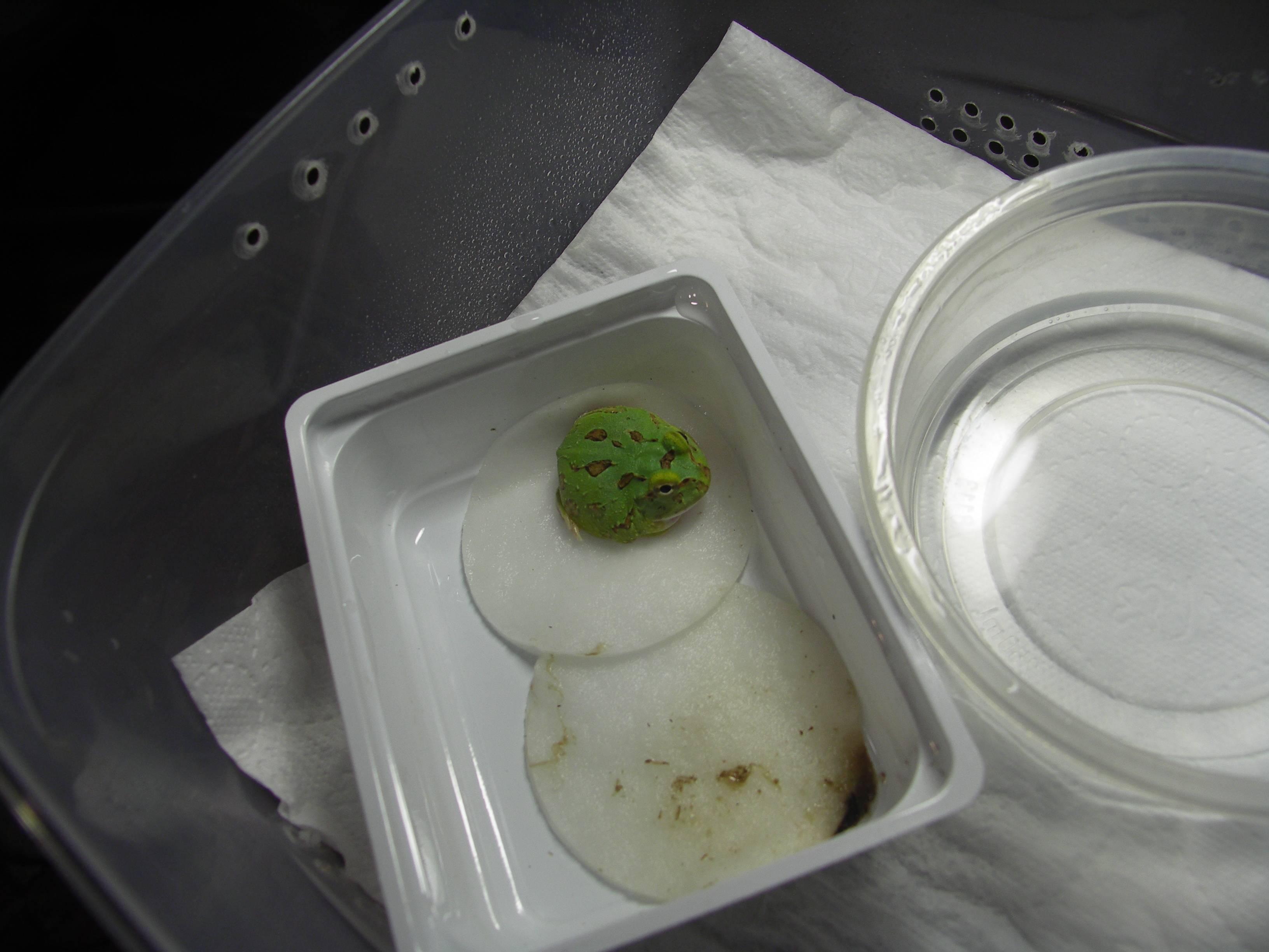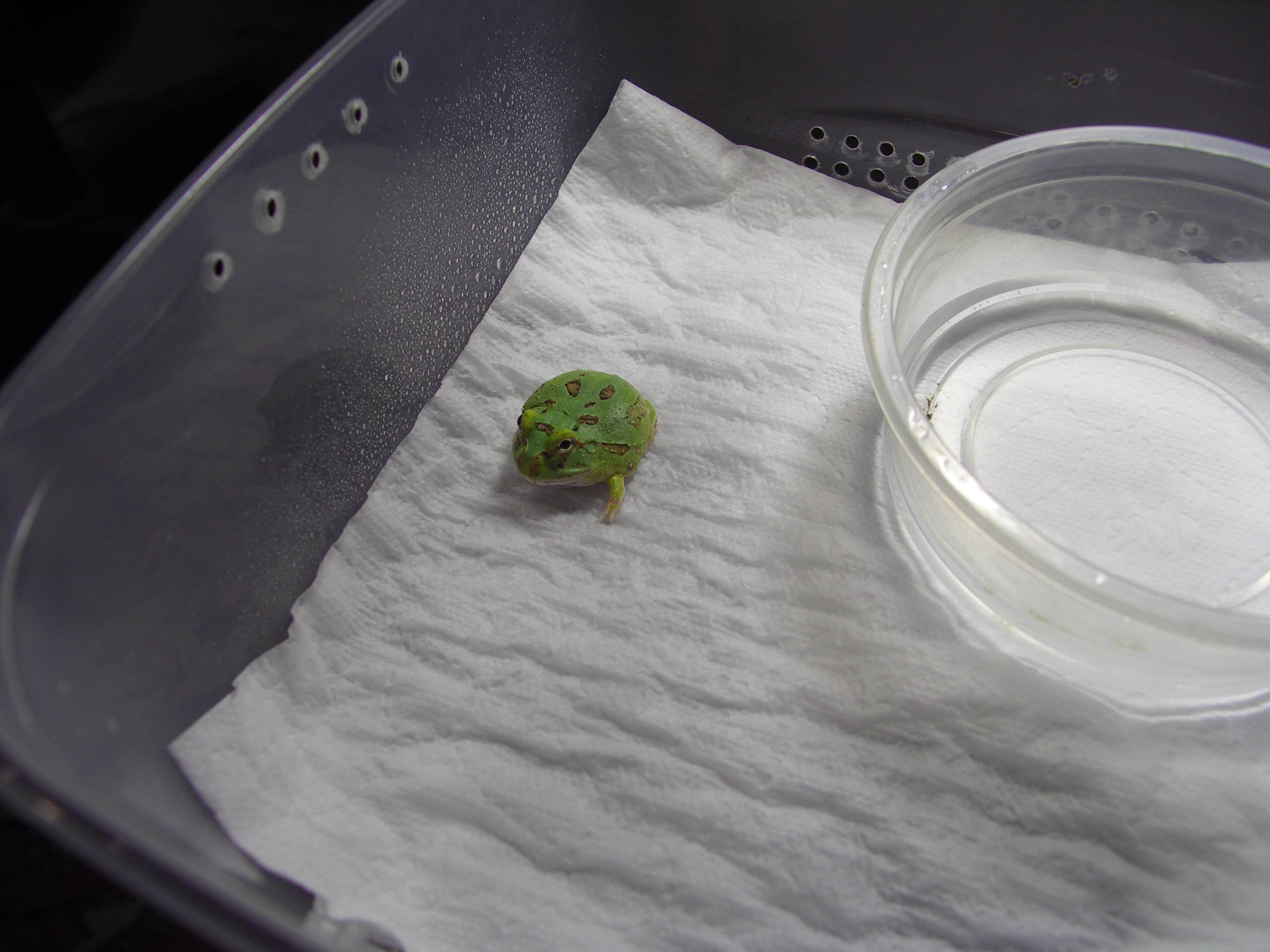 Thank you Cory! For now he's in a small plastic tub on paper towels as I don't want to scare him with too big enclosure (I'm not sure if this can happen with frogs, but it's very popular problem with young snakes so I'm doing it, haha!). In future I'd like to do more naturalistic enclosure for him (or her... for now I'm going with a boy). Our home is all the time around 80-82F, so I'm not using any additional heating in his enclosure (with all the reptiles it's easier to just keep the home at one temperature and only heat additionally the most exotic ones like ball pythons or bearded dragons.). As for feeding we tried to give him a pinky mice yesterday as the breeder told us that he should eat without problems but I guess he was stressed and didn't want to even look at it. I think I will go with the snake route, few days of leaving him totally alone (beside misting) and then we'll try to feed him. As for water we also have chinese pond turtle so some dechlorinated water is always available.