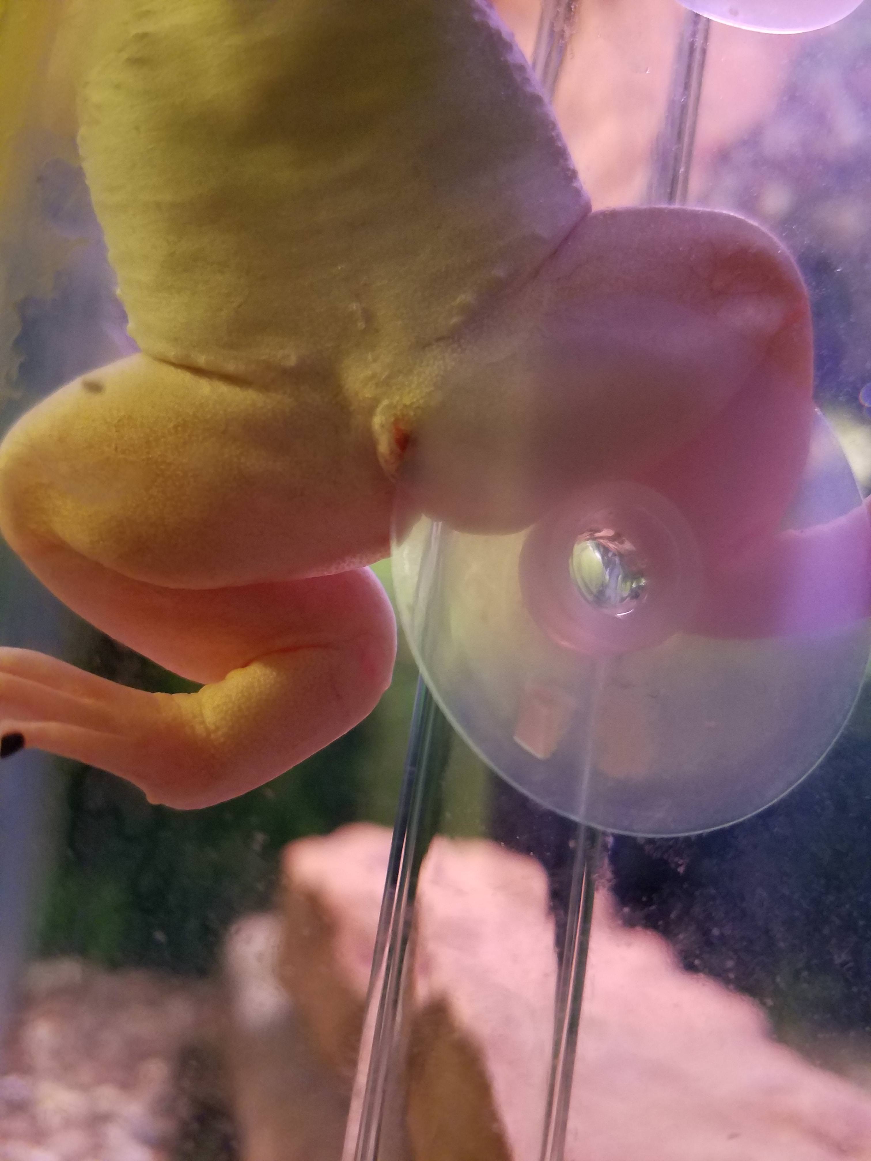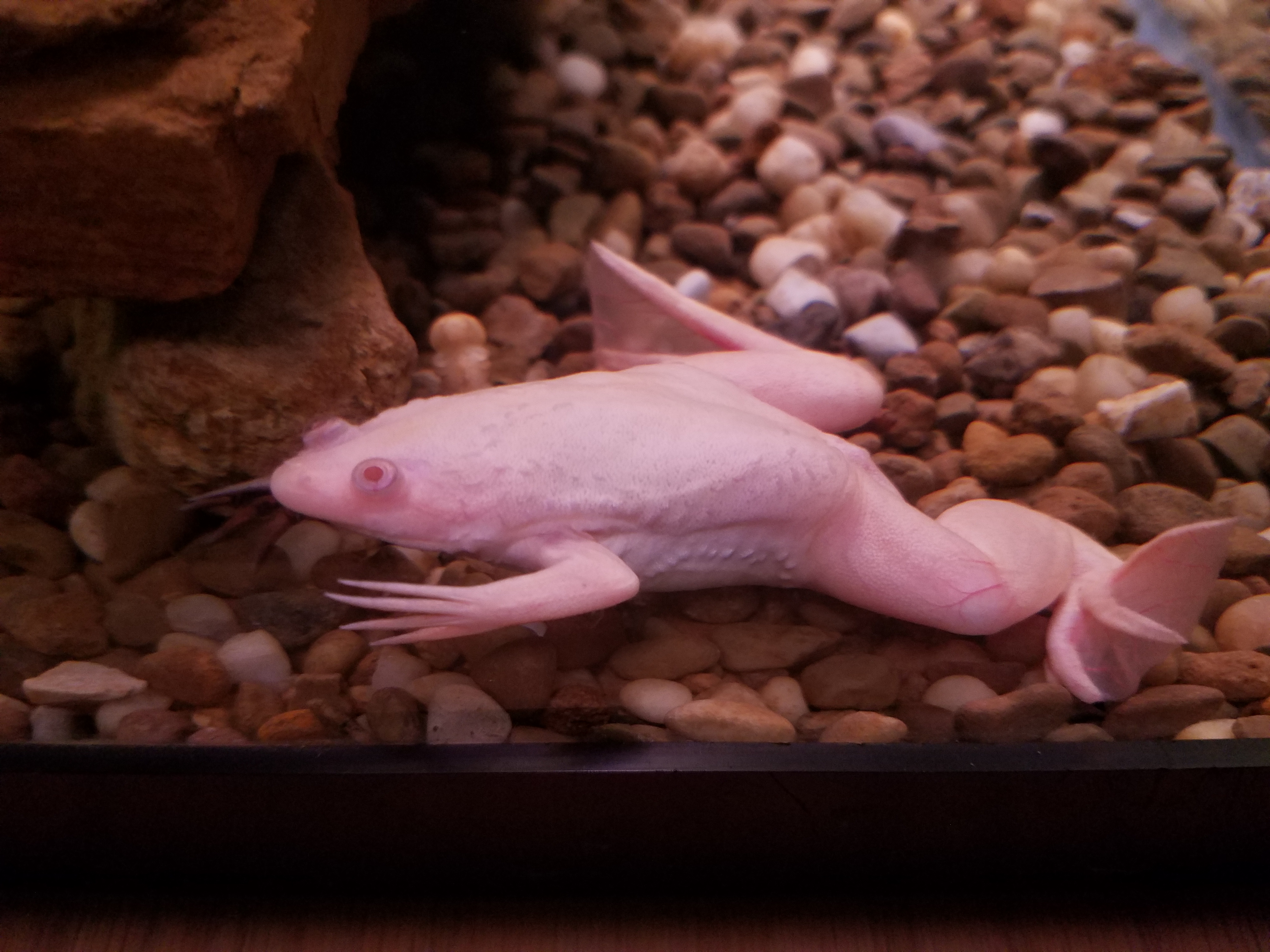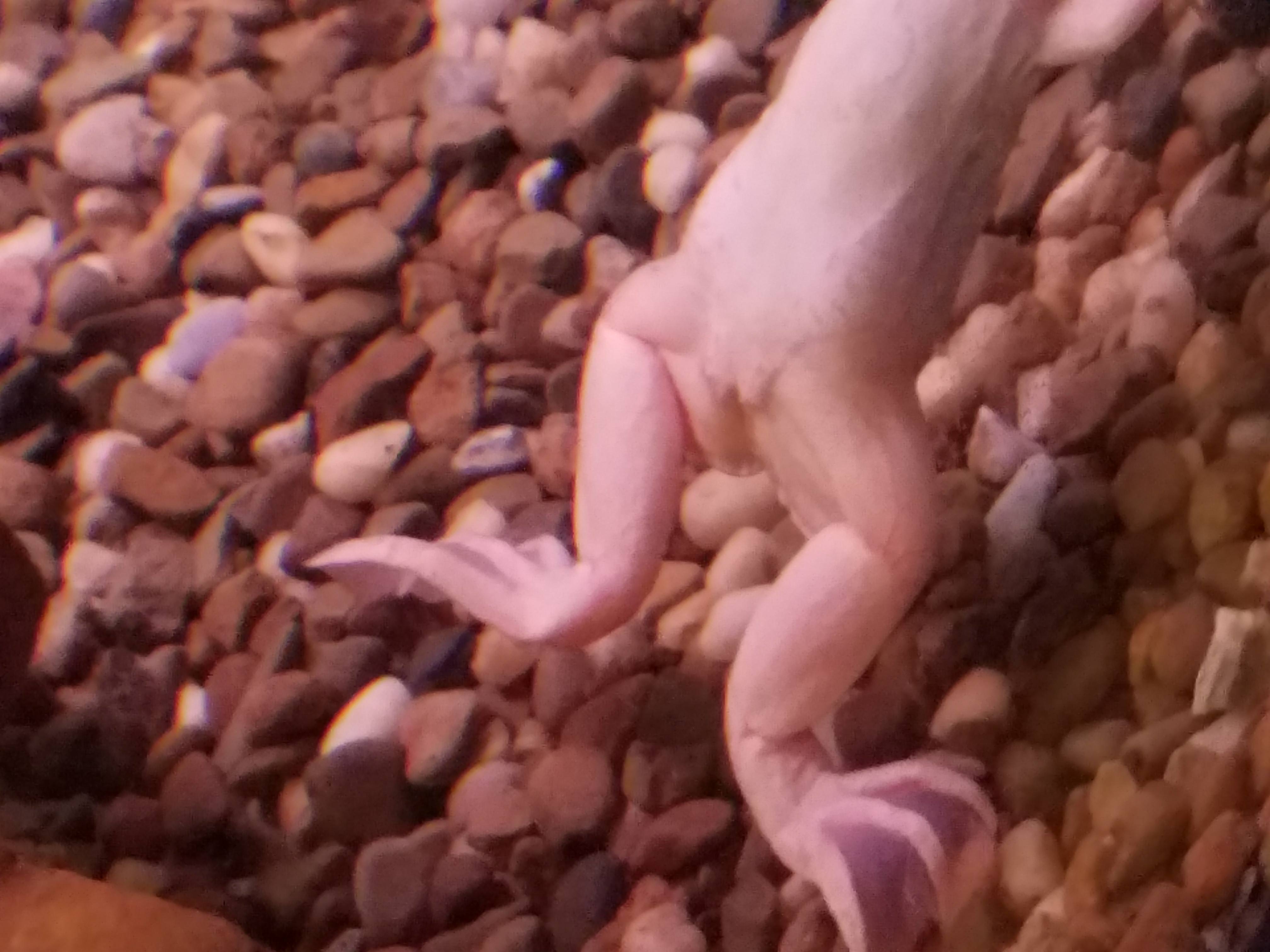 I wish I could give a better report. He's still hanging on, but it doesn't look promising. One of his toenails fell off, but appears to be growing back. One of his eyes had a red splotch on it, and the swelling on his leg almost became bruised looking. After a few days it appeared to be going down, and the red on his eye had disappeared completely. Unfortunately Friday night I came home and saw what I could only assume to be a very nasty fungal infection - the webbing on his hind legs had white spots and there were a few cottony looking spots on his body. The red eye from before re-appeared, this time on the opposite eye. I immediately administered some fungus medicine, and the following day I gave the gravel a thorough vacuuming. The tank right now hasn't been refilled since yesterday. I watched him shed his skin today (which he has been doing a lot since this started) and there was a pretty nasty red blotch on a piece of it. As of right now, the swelling on his leg is down to about where it was in the pics, maybe less so. The red eye is still there. The white spots on his body and webbing appear to be gone. He can still keep himself down at the bottom of the tank, but seems to be hanging out at the top most of the time. And sadly, he simply does not want to eat anything. He's a fighter, I'll give him that.