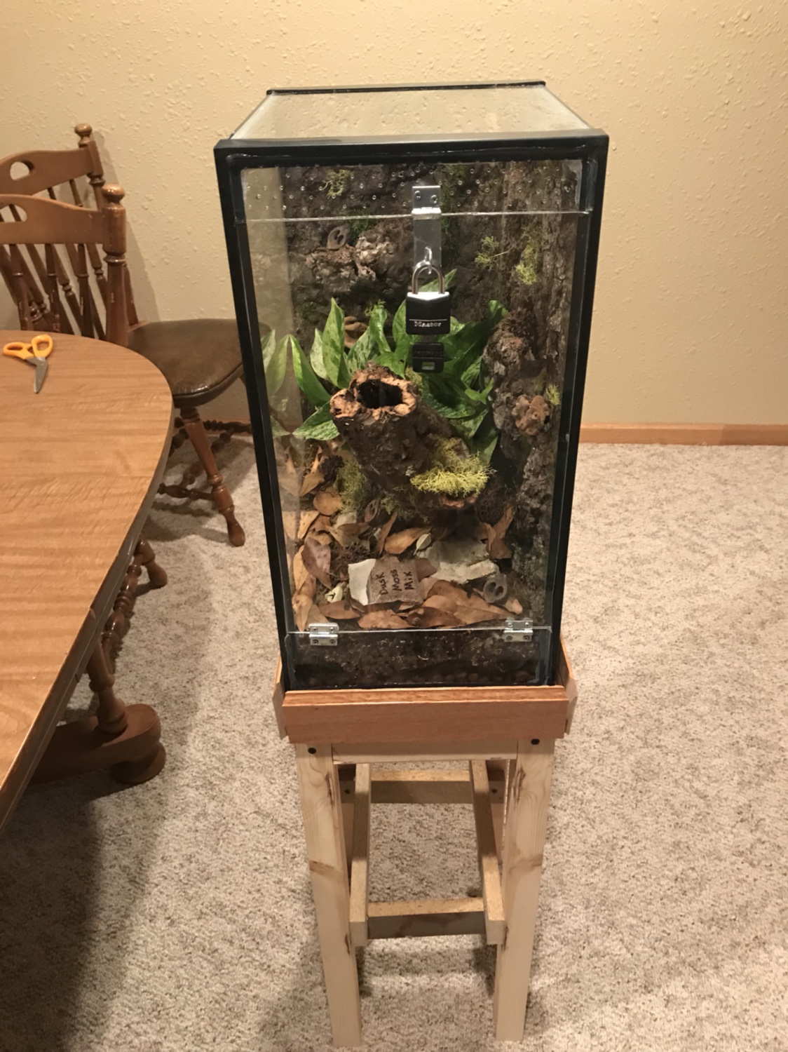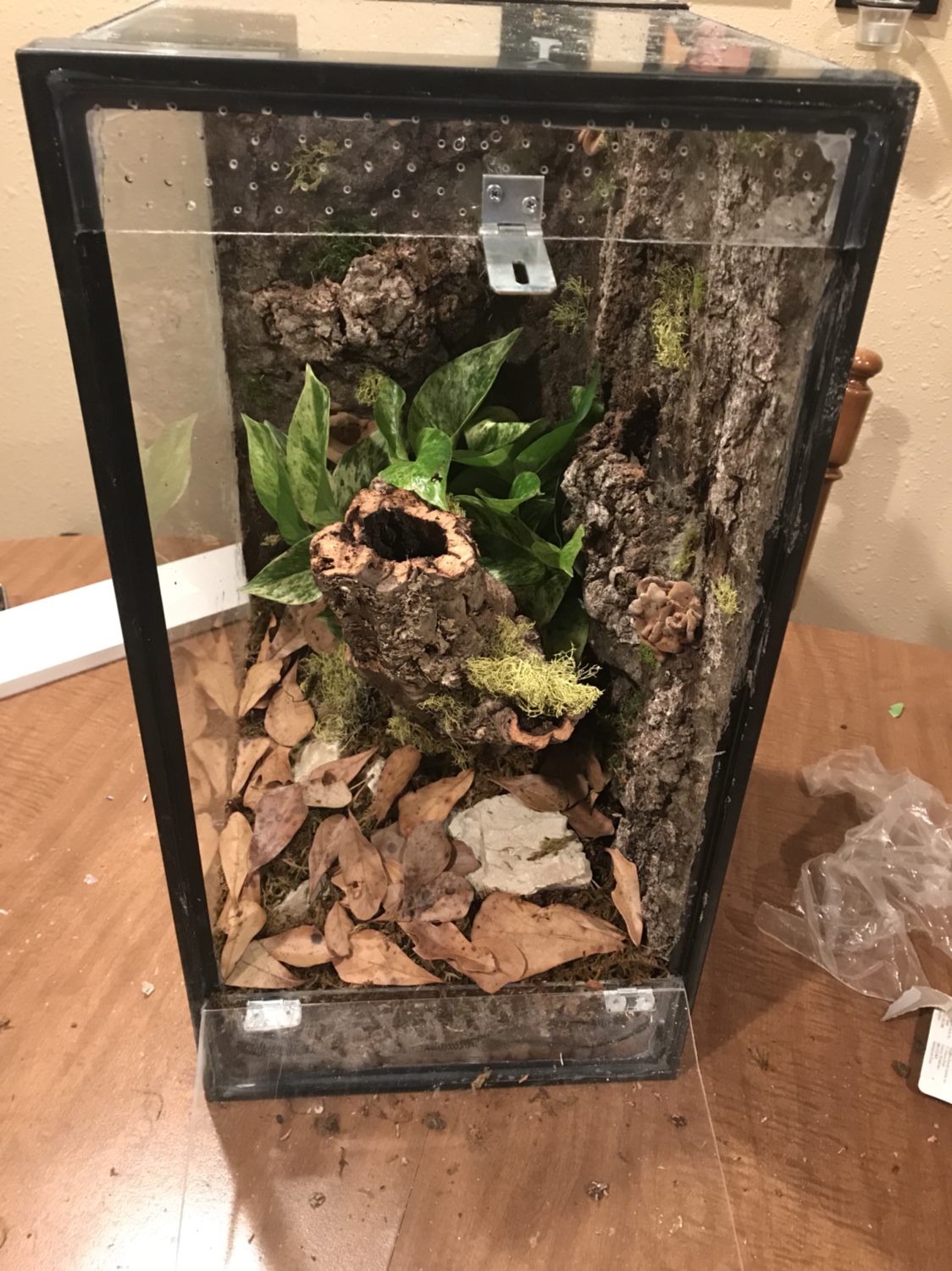 The terrarium is finally finished! It has marble queen pothos, dusk moss mix, native mosses and lichen. The background is kitty litter with peat and forest moss mixed in. I have a hydroballs baselayer then exo terra biodrain the next layer is Joshs Frogs ABG mix the last two layers are exo terra forest moss and magnolia leaves. There will be native and white springtails as well as isopods, maybe some native millipedes too.