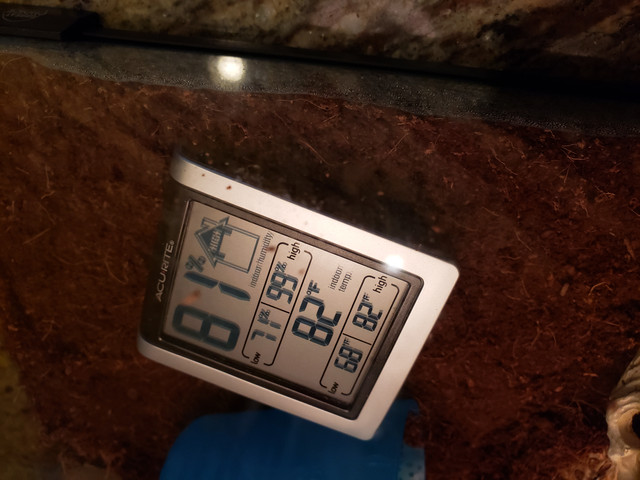 Well its night and I Jerry rigged a night light for him, using a 7.5 watt incandescent bulb made for house nightlights in a cheap clip lamp with tin foil wrapping the bottom where the light goes through. Put a 2 or 3 inch hole in the foil and taped some wax paper i colored red with crayons to cover the hole. This little light produces such little heat I can grab it by the metal lamp and hold it easy. Still will keep an eye on it for a bit longer to see if it gets hotter.