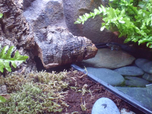 There is a large seed tray with water and rocks with a fern and piece of bark providing a sheltered area of water.