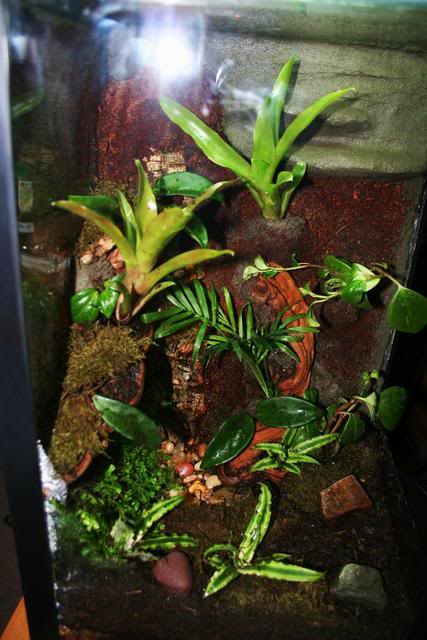 Here is a shot taken shortly after set up. I have since relocated the Broms just a tad ( "pinning" them in ) I have also added creeping fig that runs from upper left and down. Some Hoya cuttings are added to the right side of the wall and hang down. Leaf litter has also been added and seeded with springtails. I have been practicing keeping springtail and fruit fly cultures.