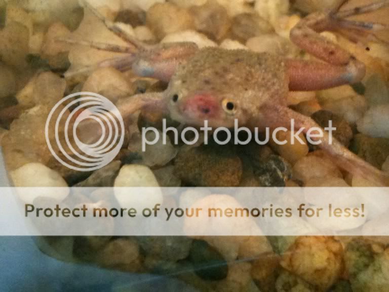 I have two dwarf frogs (seperated into two at the moment) and one has a sore lesion on her nose (looks like from a nosedive into the gravel). She wont really eat, she tries but spits it back out. Luckily she was eating really well before this happened so she isnt really skinny yet. She is in a heated filtered five gallon and gets frozen bloodworms, frozen miosis, frozen krill and on the odd occasion frog and tadpole bites.
